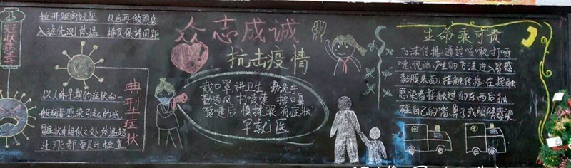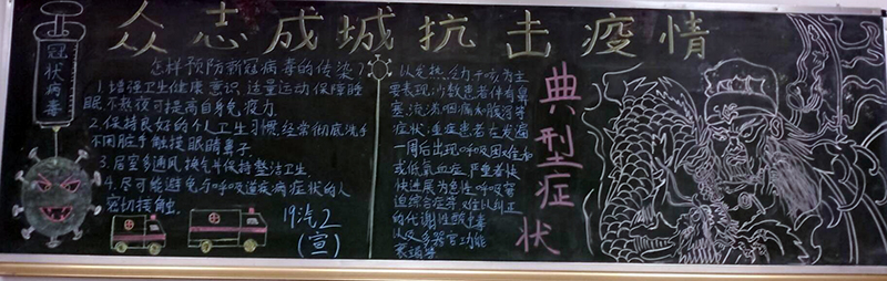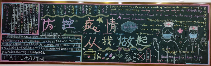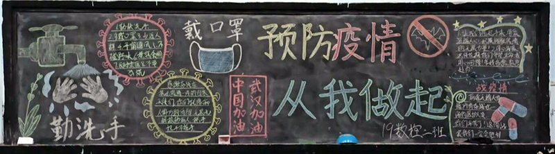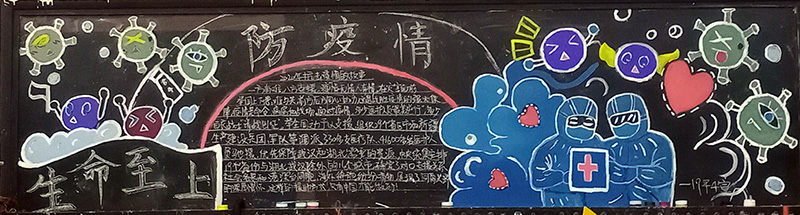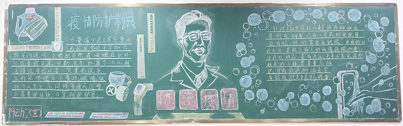 在本期黑板报设计中,各班紧扣防控疫情主题,洗手、戴口罩等成为了很多班级的宣传素材,防疫宣传标语、防疫常识成为黑板报的主要内容。同学们在设计、布置、欣赏黑板报的过程中,提高了疫情防控意识,强化了健康卫生知识。瞧那一块块黑板,图文并茂,鲜活生动,既表达了对战斗在抗疫一线的白衣天使的敬意,又宣传了防疫知识,营造了人人知晓、科学防控的良好氛围,充满力量,传递了疫情防护正能量。