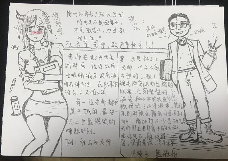 大家纷纷拿起了手中的画笔,以漫画的形式捕捉身边教师教育教学过程中的片段,将平日里敬业爱岗、不苟言笑的老师,绘成一个个生动可爱的动漫形象。