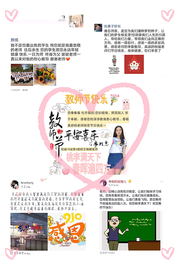 为增进师生的情谊,让老师们度过一个难忘的教师节,校团委还组织同学们开展网络留言送祝福活动,向辛苦工作的老师们致以最真挚的节日祝福。