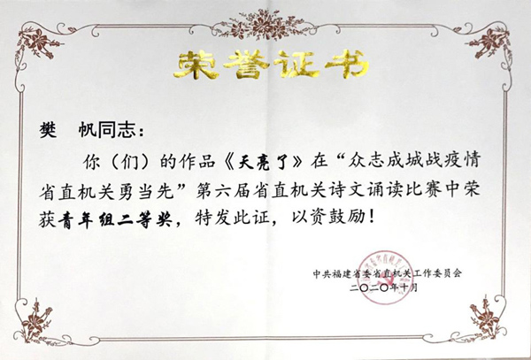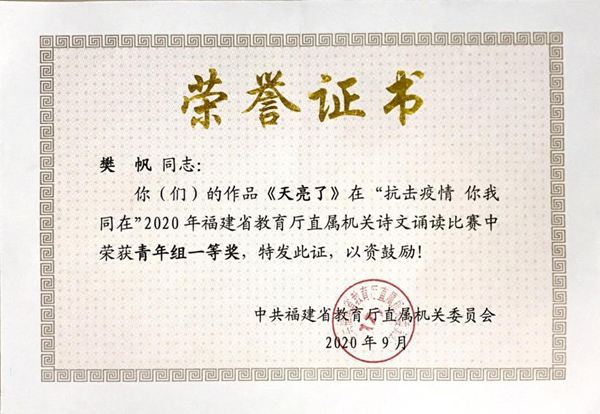 在福建省教育厅直属机关委员会组织的“抗击疫情,你我同在”诗文诵读比赛中,我校樊帆老师的作品《天亮了》荣获一等奖,后被选送参加福建省直机关工委组织的“众志成城战疫情,省直机关勇当先”第六届省直机关诗文诵读比赛,从85个参赛单位277件参赛作品中脱颖而出,荣获二等奖。