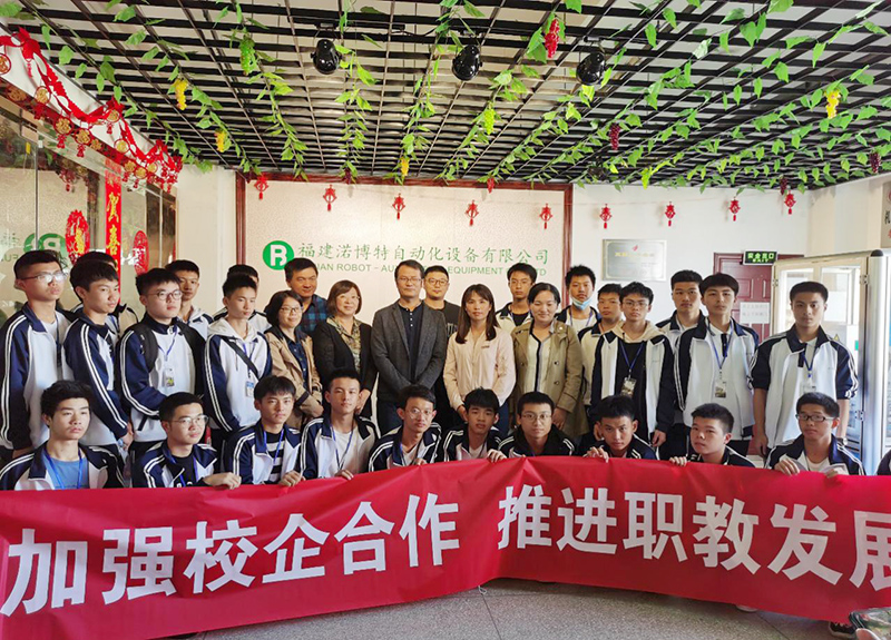 为弘扬劳动光荣、技能宝贵、创造伟大的时代风尚,营造全社会关心支持职业教育的良好氛围,展示我校兴校办学最新成就,2020年11月10日,福建工业学校机械专业教学部林健清主任、张文祥副主任带队,教学部部分教研组长、教师、班主任及20级工业机器人班全体学生走进福建渃博特自动化设备有限公司开展福建省2020年职教周宣传交流活动。