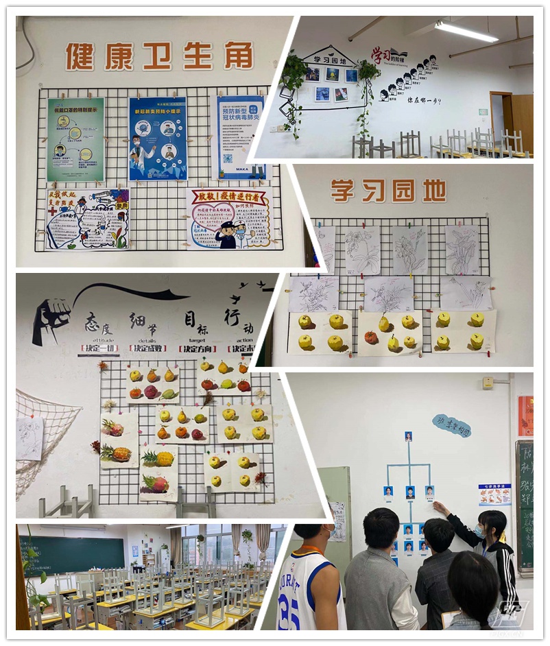 各班在班主任的指导下,在全体同学的努力下,做好学习园地、照片墙、图书角、荣誉墙等布置,展现出了不同的特色:有的绚丽多彩,有的淡雅脱俗,有的整洁规范……