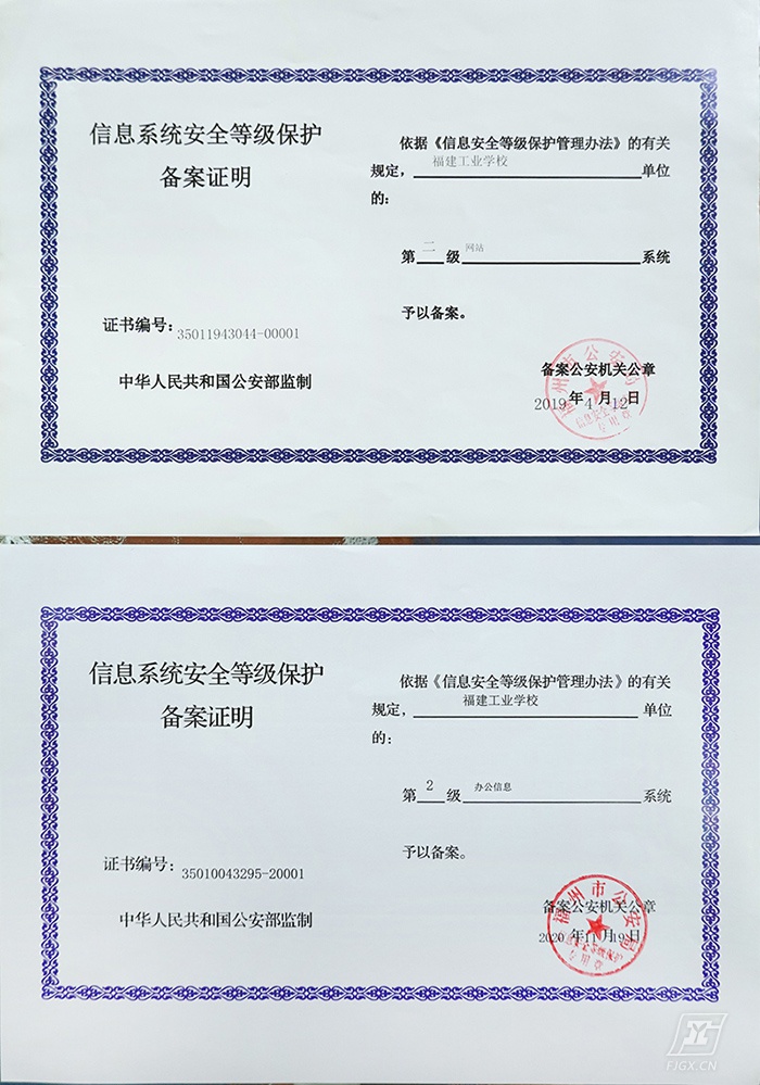经过前期的努力,我校于2020年11月19日,取得了学校官网和OA办公系统的二级等保备案证书。
