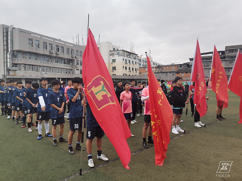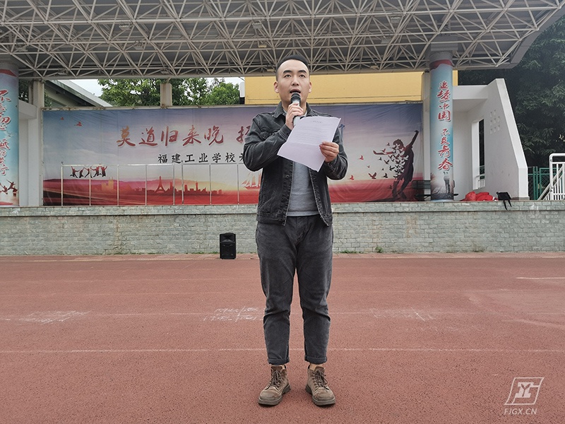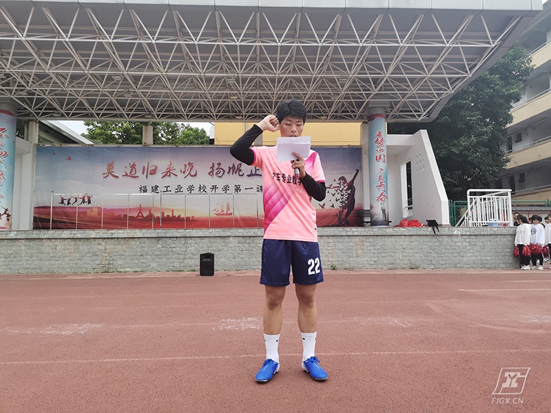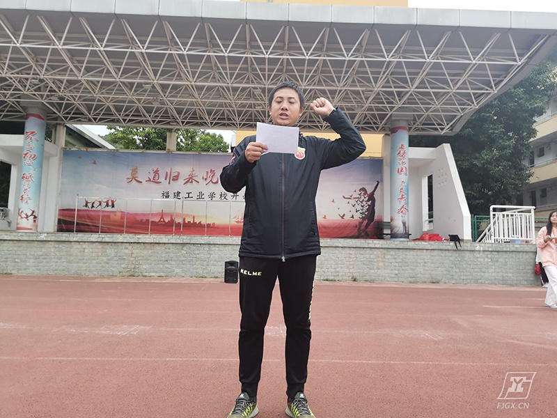 集合完毕,裁判员代表徐诗程老师,足球社社长江华钦同学先后进行了宣誓。