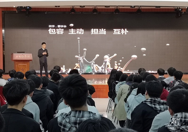 会上,吴总介绍了公司基本情况及公司产品设计,回顾了他的学习生涯与毕业十年的职业历程。随后,他从思维模式、做事方法、处世态度等方面进行经验分享,并为计划升学的同学们提供了几点建议:一是设定好近期、中期、长期的目标,二是定期思考多做总结,三是充分利用大学时间,多学知识与技能,四是干对的事做对的人。最后,吴总以“大家一起创青春”为结束语,鼓励同学们站得高一点,看得更远一点,岁月不饶人,趁着年轻,多折腾多学习。