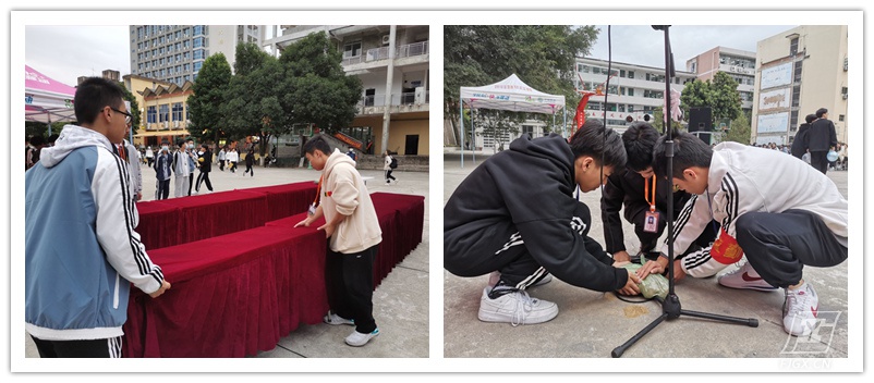 比赛前夕,两委干事们有条不紊、互相配合,布置舞台、搭架子、摆帐篷、现场调音、测试麦克风等,确保活动顺利进行。