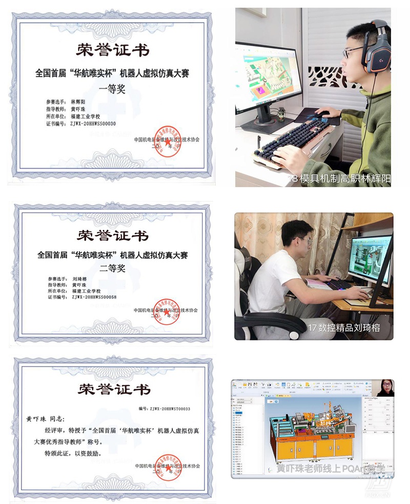 全国首届“华航唯实杯”机器人虚拟仿真大赛于4月10日在线上成功举行。代表我校参赛的两位选手表现出色,18模具机制高职班林辉阳同学勇夺一等奖,17数控精品班刘琦榕同学喜获二等奖,两位同学的指导教师黄吓珠老师获得优秀指导教师奖。