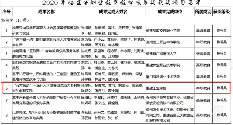 近年来,福建工业学校致力于这方面的尝试,与福建有伦农业科技有限公司、三明市尤县联合镇政府、福州市蔬菜科学研究所、福州市农业科学研究所、福州市气象局、浙江大学全球创业研究中心等开展深度合作,创造性融合“校、企、政、研、创”五方优势资源,构建起产教融合、校企合作的利益共同体,为助力乡村振兴提供技能人才支撑,获得了福建电视台乡村振兴·公共频道的专题报道,《“五方联动”——深化人才培养改革助力乡村振兴的创新实践》案例获得2020年福建省职业教育教学成果特等奖。