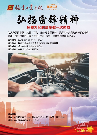 今年是第58个学雷锋纪念日,为大力弘扬奉献、友爱、互助、进步的志愿精神,发挥共产党员的先锋模范带头作用,我校第四党支部与福州乐道汽车服务有限公司党支部、福州市仓山区建新镇劳光村党支部,于2021年3月20日上午在学校上汽大众SCEP福建培训基地联合开展“专业+技术+服务”学雷锋志愿服务活动。