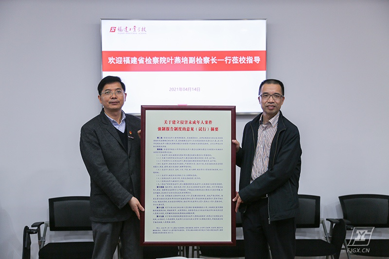 会后,叶燕培副检察长代表福建省检察院向我校赠送“一号检察建议”和“华体会平台建立未成年人案件强制报告制度的意见(试行)摘要”牌匾。