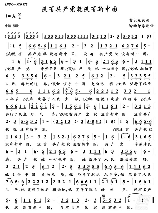 1943年,19岁的曹火星已是晋察冀边区抗日救国联合会群众剧社的音乐组组长,在10月深秋的夜晚,曹火星回想到之前在剧社和大家在一起的日子,感到生活在革命队伍中的温暖;再联想到亲眼目睹的抗日根据地广大人民群众在共产党的领导下,克服种种困难坚持抗战的情形,脑海中突然跳出前几天读过的延安《解放日报》上的一篇社论文章——《没有共产党就没有中国》。想到这些,曹火星便在纸上写下了一句话:“没有共产党就没有中国”,新歌的题目诞生了,曹火星一边哼唱一边写写画画,经过反复修改,歌曲《没有共产党就没有中国》诞生了。