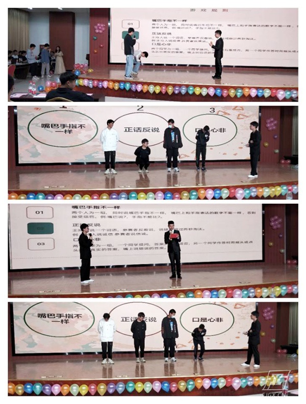 比赛中还穿插了游戏环节,主持人邀请台下同学一起参与,同学们欢呼雀跃,现场气氛轻松欢乐。