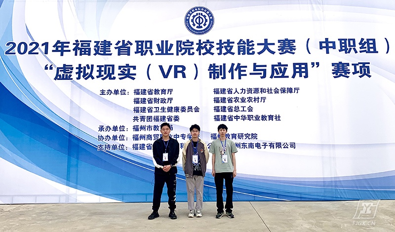 18动漫2班吴光煜,19数媒高职班赖烨磊、石梁鸿3位同学荣获“虚拟现实(VR)制作与应用”赛项团体三等奖,指导老师为黄河、全政文老师。