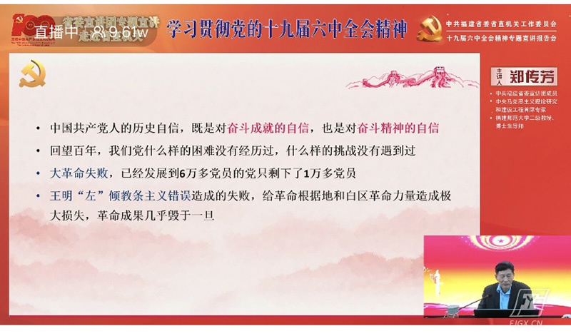 2021年11月29日,省直机关工委举办“省委宣讲团走进省直机关”学习贯彻党的十九届六中全会精神线上专题宣讲报告会。中共福建省委宣讲团成员、中共马克思主义理论研究和建设工程首席专家、福建师范大学二级教授、博士生导师郑传芳同志作宣讲报告,中共福建省委省直机关工委副书记、一级巡视员林江铃主持报告会。