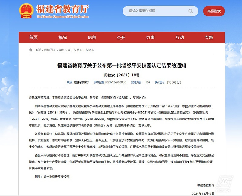 日前,省教育厅公布第一批省级平安校园认定结果,全省共752所学校(幼儿园)入选,我校名列其中。