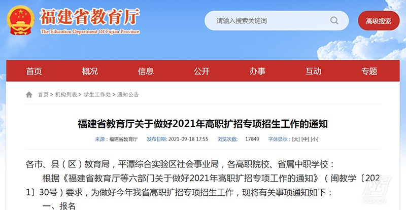 福建省教育厅华体会平台做好2021年高职扩招专项招生工作的通知