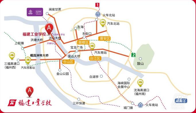 福州汽车客运西站:地铁2号线福建师大站→金山站下车→地铁5号线金山站→农林大学站下车