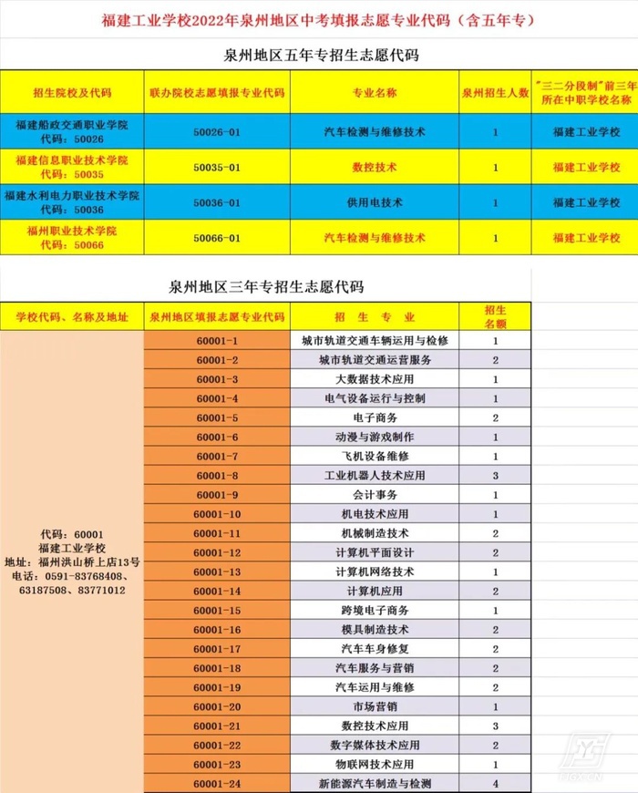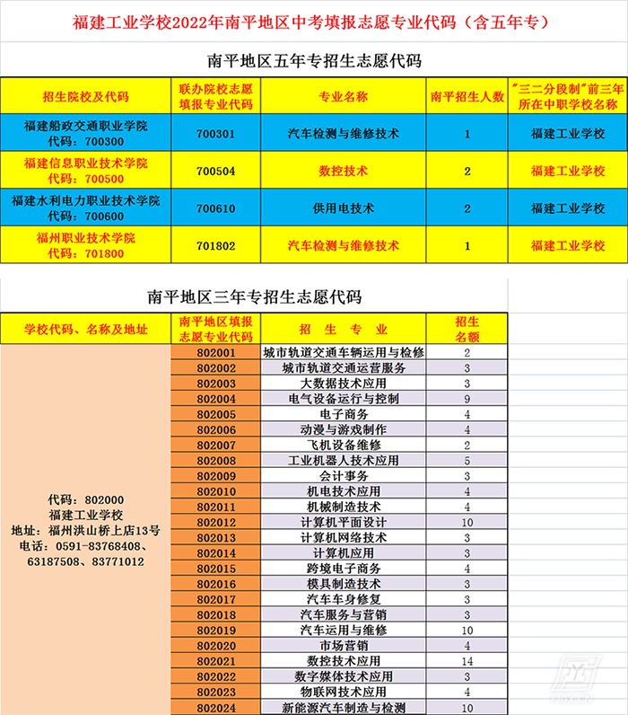 福建工业学校2022年南平、泉州地区中考填报志愿专业代码(含五年专)