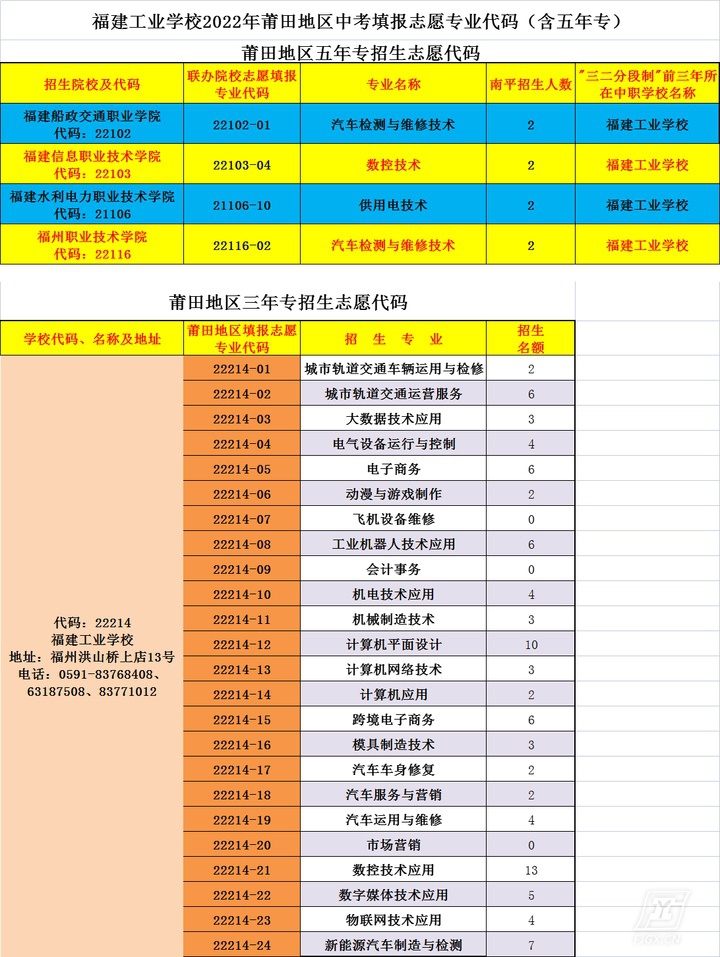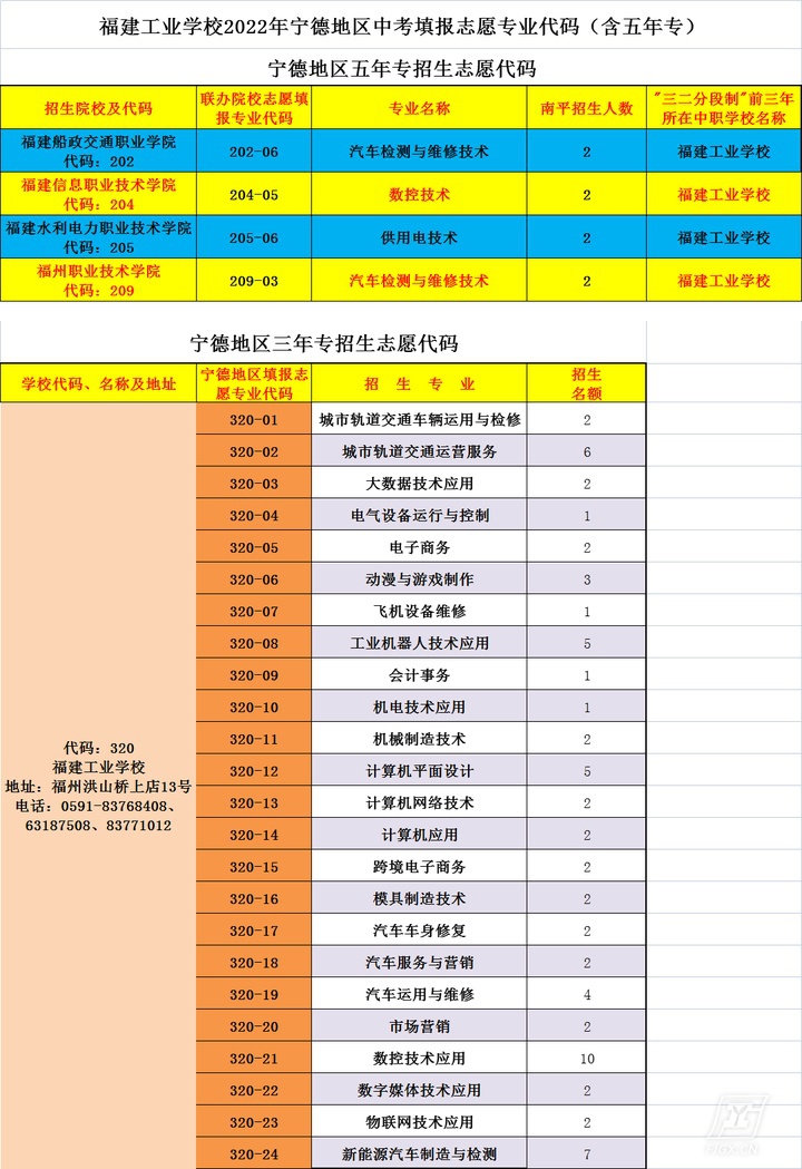 福建工业学校2022年莆田、宁德地区中考填报志愿专业代码(含五年专)