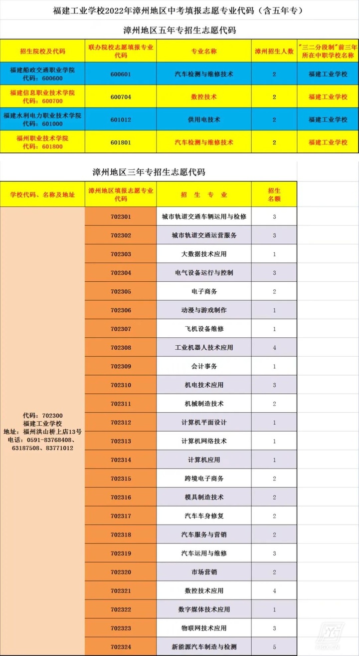 福建工业学校2022年漳州地区中考填报志愿专业代码(含五年专)
