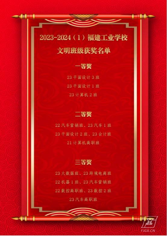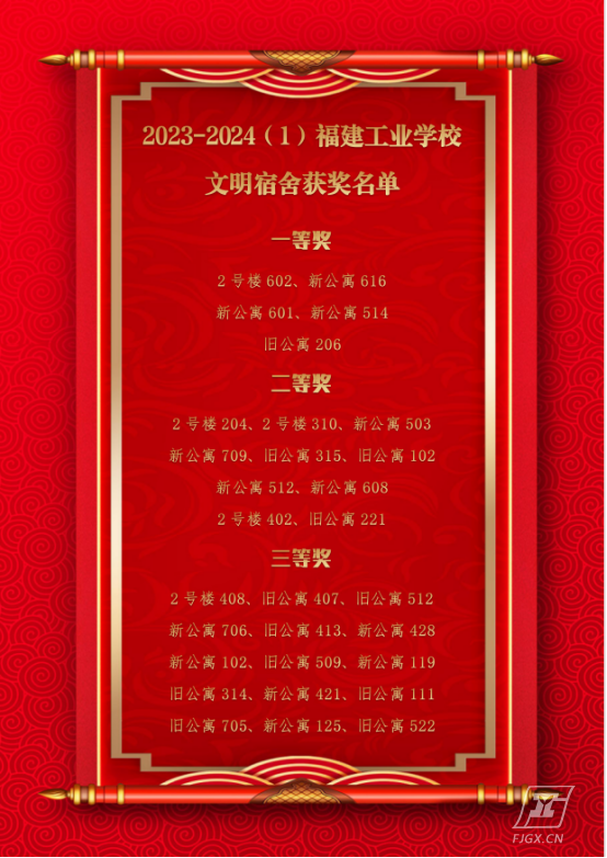 本次文明评比活动最终评出文明班级一等奖3名、二等奖5名、三等奖7名;文明宿舍一等奖5名、二等奖10名、三等奖15名。希望全体同学以文明为标准,以优秀为榜样,再接再厉,共同努力创造文明校园。