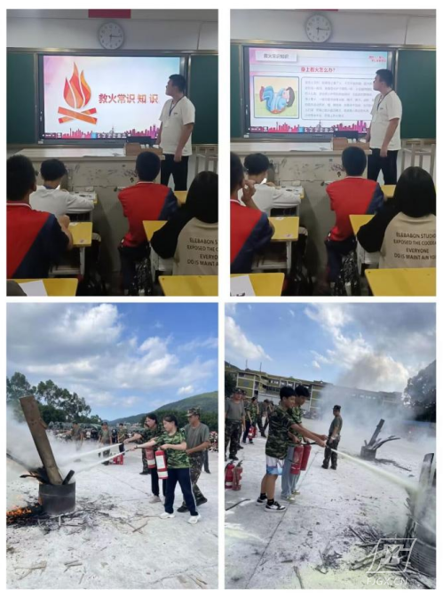 活动前,同学们以小组为单位,分工合作、搜集信息。活动过程中,每组代表上台讲解消防知识,开展消防情景问答。课后,同学们移步操场,在教官的带领下学习如何使用灭火器。