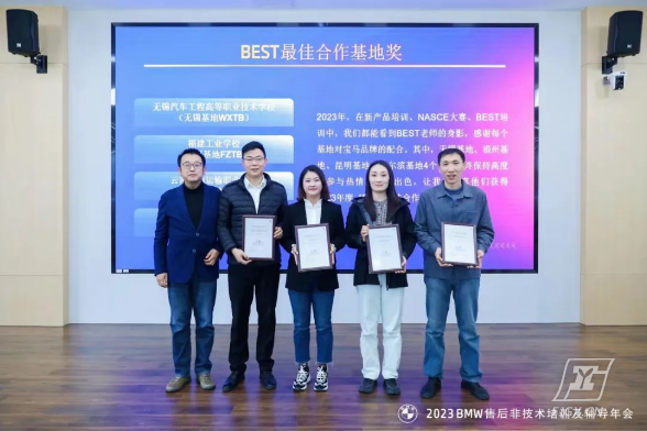 在年会颁奖典礼上,我校喜获BEST非技术年度最佳合作基地奖,邵鹭老师喜获宝马十年贡献奖,康秀芬老师、林辉老师、闵进波老师、张梦思老师分别取得宝马BEST项目非技术和销售的讲师认证资质。