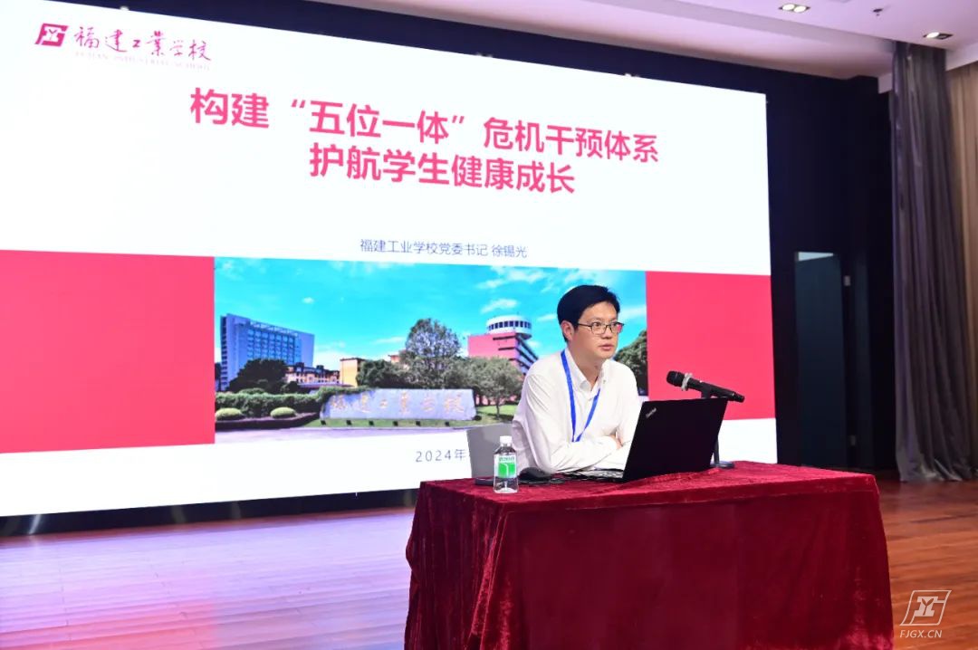 我校党委书记徐锡光老师在大会上作了《构建“五位一体”危机干预体系 护航学生健康成长》专题报告。他介绍了我校心理健康教育的特色做法及成效:一是聚焦组织协调,构建心理危机干预的指挥体系;二是聚焦机制发展,构建心理危机干预的监测体系;三是聚焦凝心聚力,打造高专业素养的教育体系;四是聚焦活动共享,打造全方位心理危机干预的活动体系;五是聚焦家校社联动,搭建多方参与心理危机干预的网络体系。