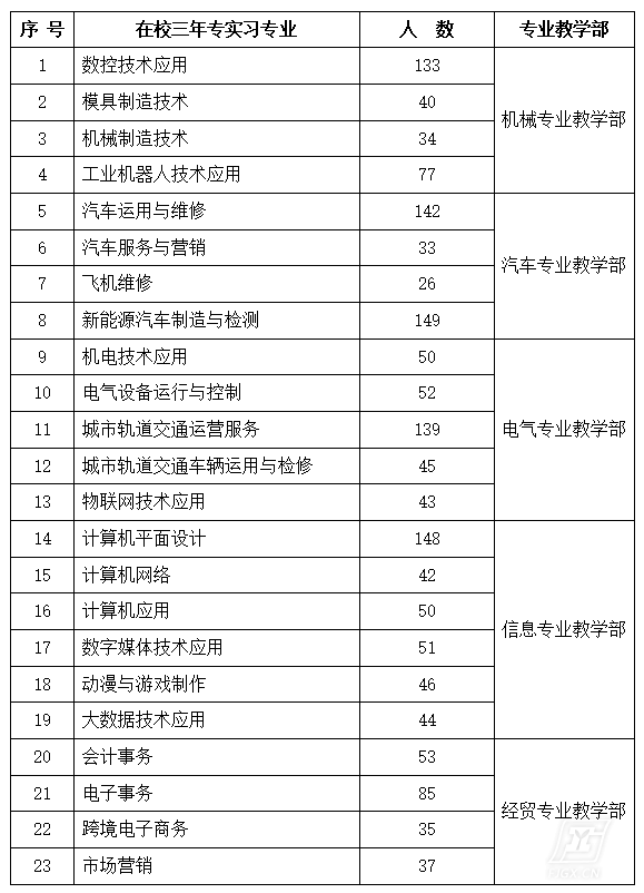 我校现有5个专业部,2024届参与实习专业23个,本年度实习学生数1554人,详见下表。