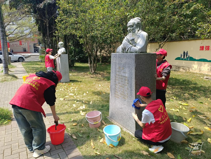 志愿者们不畏炎热,手提水桶,手握抹布,认真而专注地擦拭着校道上的每一座雕像,展现出极高的奉献精神和团队协作意识。大家不怕脏、不怕累,个个奋力争先、互帮互助,将原本略显陈旧的雕像擦拭得焕然一新。