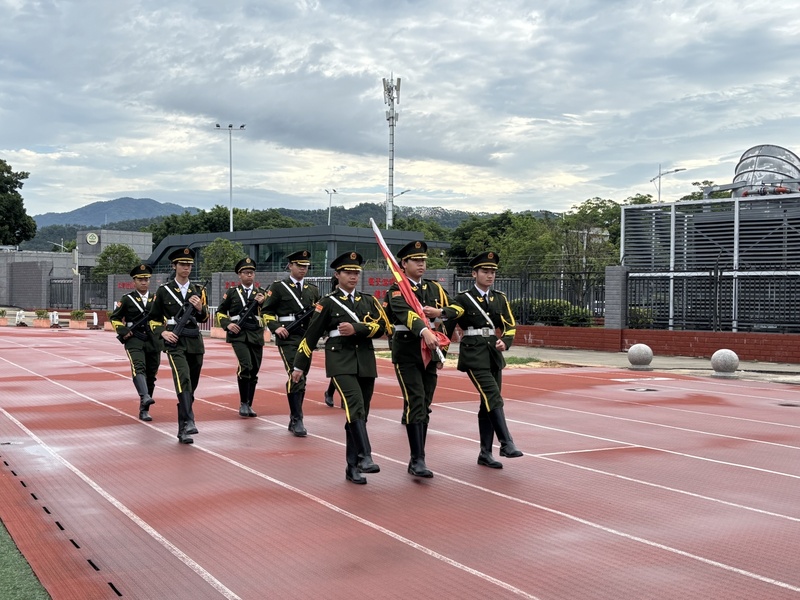 清晨,伴随着激昂的进行曲,国旗护卫队迈着整齐有力的步伐护送国旗至升旗台下。在全体师生庄严肃穆的注目礼中,五星红旗冉冉升起,迎风飘扬,爱国之情在每个人心中激荡。