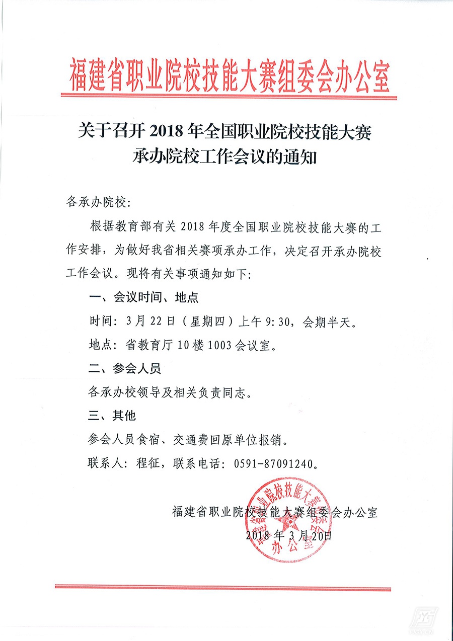 福建省华体会平台召开2018年全国职业院校技能大赛承办校工作会议的通知
