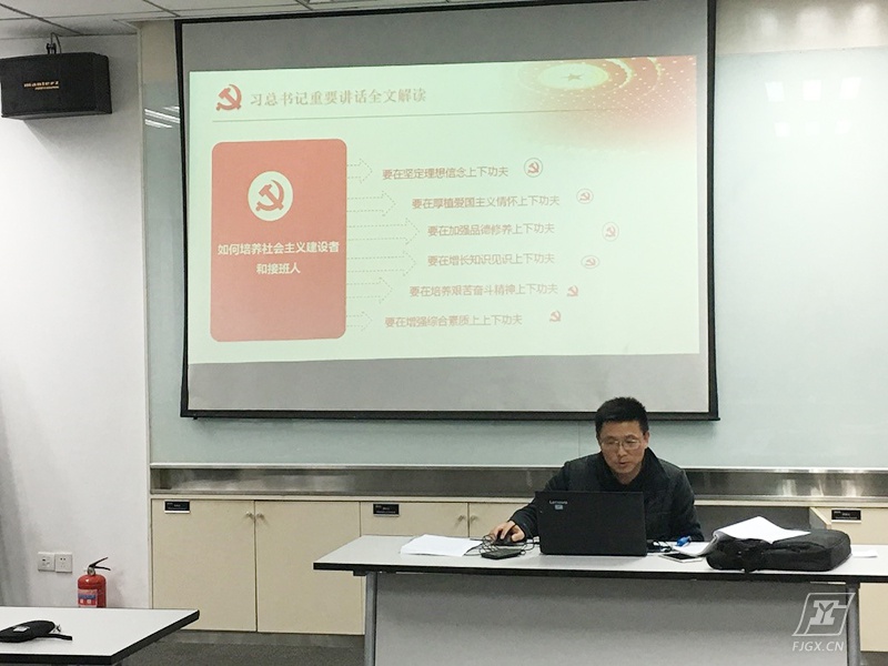 杨尊东副校长的党课主题是:习近平总书记重要讲话全文解读,杨副校长着重从教育的定位,九个坚持,教育的首要问题,师资队伍建设,破除“五唯”顽疾等几个方面加以阐述。