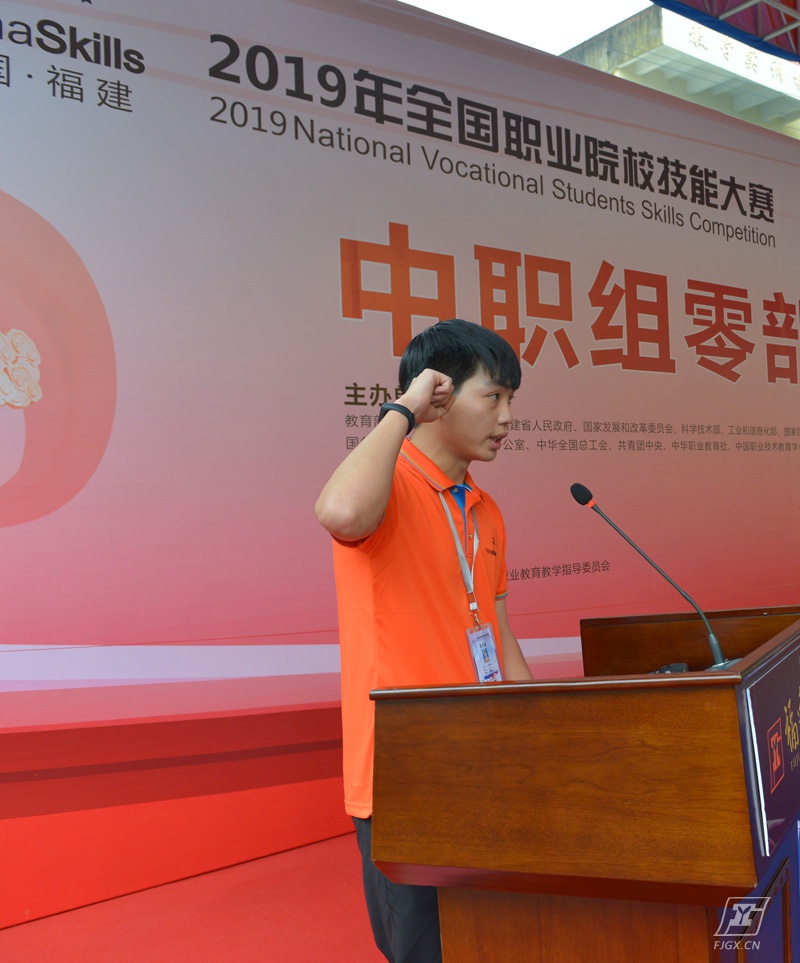 随后,裁判员代表袁晓玲教授、参赛选手代表林鸿鑫学生分别宣誓。赵俊贵会长宣布2019年全国职业院校技能大赛(中职组)零部件测绘与CAD成图技术赛项正式开赛。